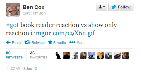 I've got to say, I took a kind of sadistic glee when I realized that's what episode had aired. Quite a few of my coworkers watch the show, but had never read the books, and the mood in the office the next morning was incredibly morose. I also enjoyed this compilation of people watching the scene for the first time. Glad to see I'm not the only sadist out there.